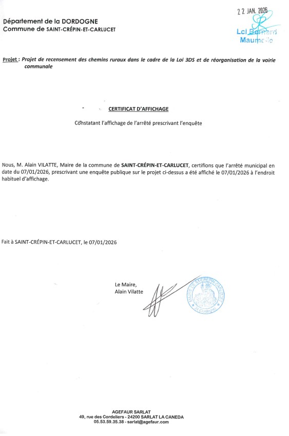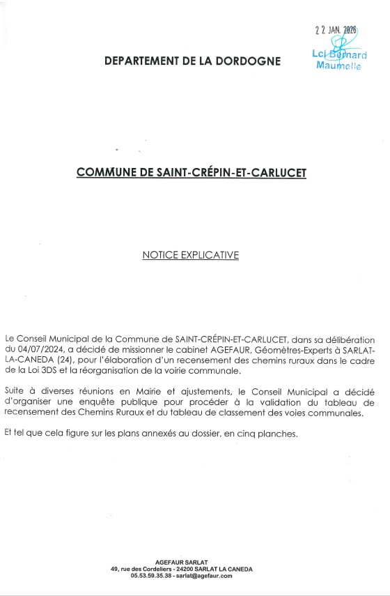 Dans le cadre de la Loi 3DS, et par arrêté du 7 janvier 2026, M. le Maire a prescrit l'ouverture d'une enquête publique portant sur le projet de recensement des chemins ruraux et de la réorganisation de la voirie communale.